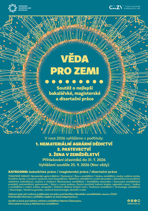 Rádi bychom Vás informovali o vyhlášení XI. ročníku soutěže Věda pro zemi o nejlepší bakalářskou, magisterskou a doktorskou práci. Soutěž vyhlašuje Národní zemědělské muzeum ve spolupráci s Českou akademií zemědělských věd. Termín pro zaslání přihlášky je do 31. července 2026.