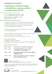 Dovolujeme si Vás pozvat na interaktivní seminář „Digitalizace uhlíkové stopy v zemědělství a potravinářství a problematika EUDR“, který pořádá dne 14. 5. 2026 Česká akademie zemědělských věd (ČAZV). Odborným garantem akce je Odbor ekonomiky, řízení, sociologie a informatiky (OEŘSI) ČAZV. Semináře je možné se účastnit osobně, a to ve Velkém sále Domu zemědělské osvěty, Slezská 100/7 Praha 2, nebo online přes odkaz zde >>.
