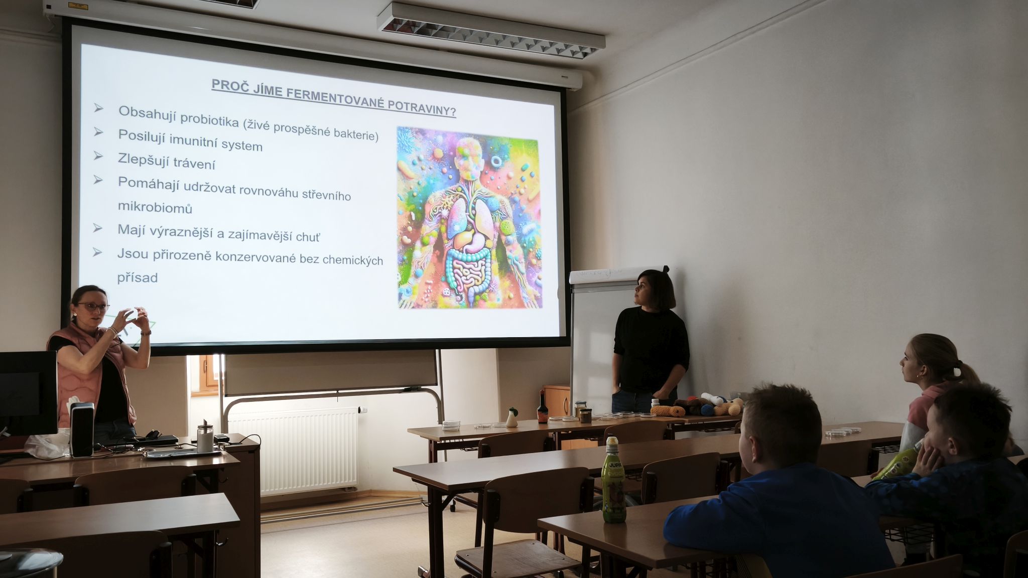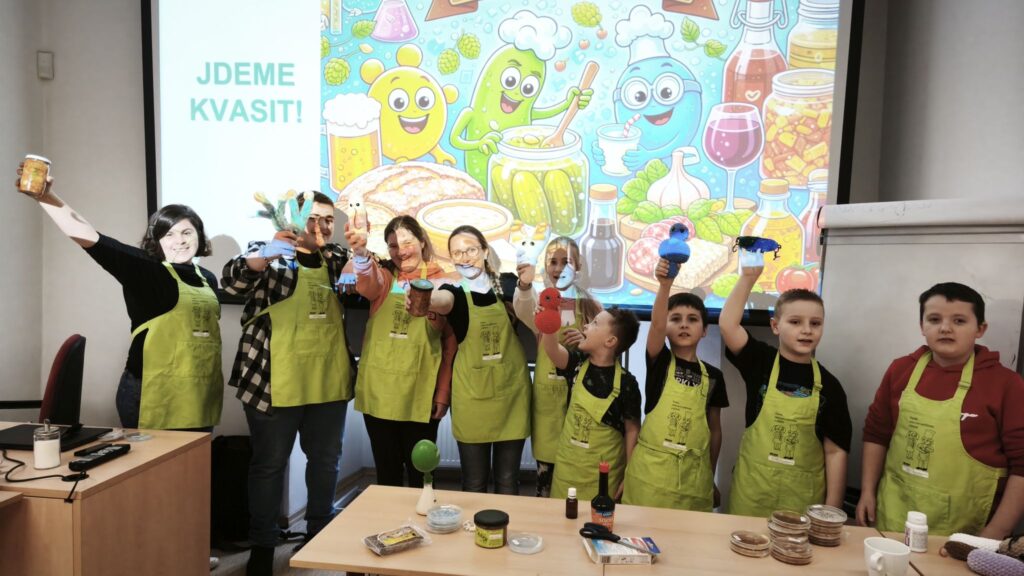 Během interaktivní přednášky se děti seznámily s fascinujícím světem mikroorganismů – dozvěděly se, co mikroorganismy jsou, kdo je jako první objevil a jak významnou roli hrají v našem každodenním životě. Děti dále zjistily, že mezi mikroorganismy najdeme nejen „hodné“, ale i méně přátelské zástupce, a že každý člověk má svůj jedinečný mikrobiom. Zároveň si uvědomily, že bez mikroorganismů by nevznikla řada běžných potravin, jako jsou sýry, jogurty nebo kvašené nápoje.
